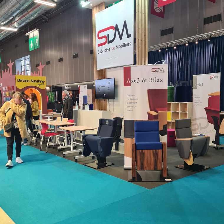 Les fauteuils d’amphithéâtre Axe 3 & Bilax ont particulièrement marqué les visiteurs, notamment avec le modèle ayant équipé le nouveau Campus PSG, emblématique du savoir-faire de SDM en matière de projets sur-mesure pour les grandes enceintes sportives et culturelles.